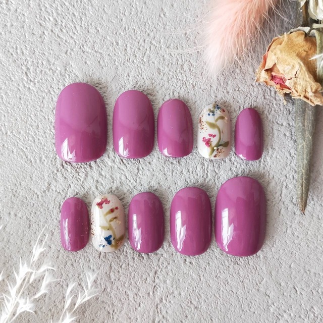 フェミニンで上品な大人のためのフラワーネイルチップが登場しました。 手元を華やかに彩り、周囲の人々を魅了する美しいネイルアート。 パープルよりのピンクが落ち着いた雰囲気を醸し出し、押し花アートが繊細なアクセントとなっています。 デイリーユースから特別な日まで幅広くお楽しみいただけます。 ※写真はラウンドショート使用。 【初めてオーダーチップをご購入のお客様へ】 初めて当店のオーダーチップをご購入のお客様は、TOP画面にある「サイズ確認用チップ」をお買い求めください。(実質無料)