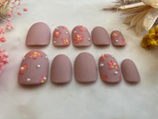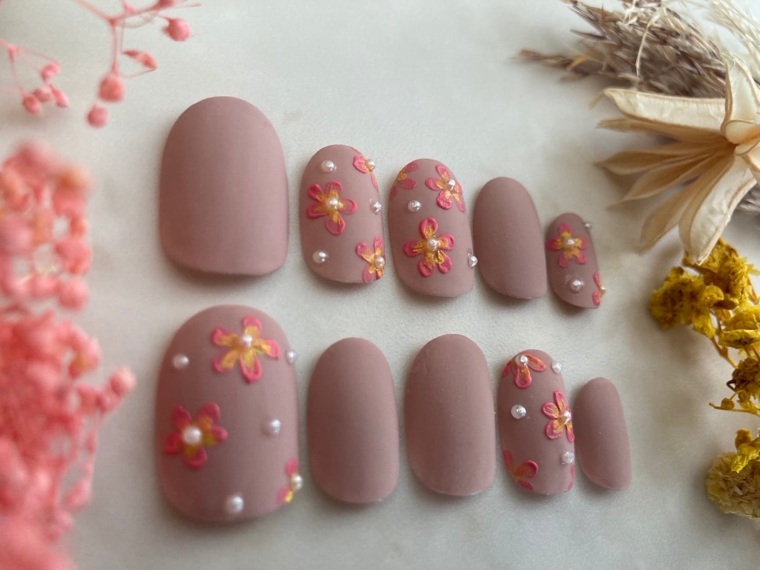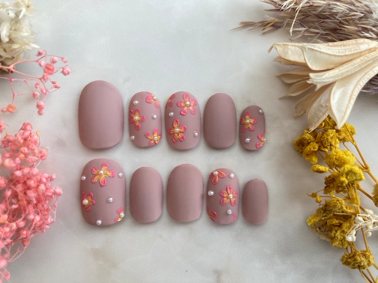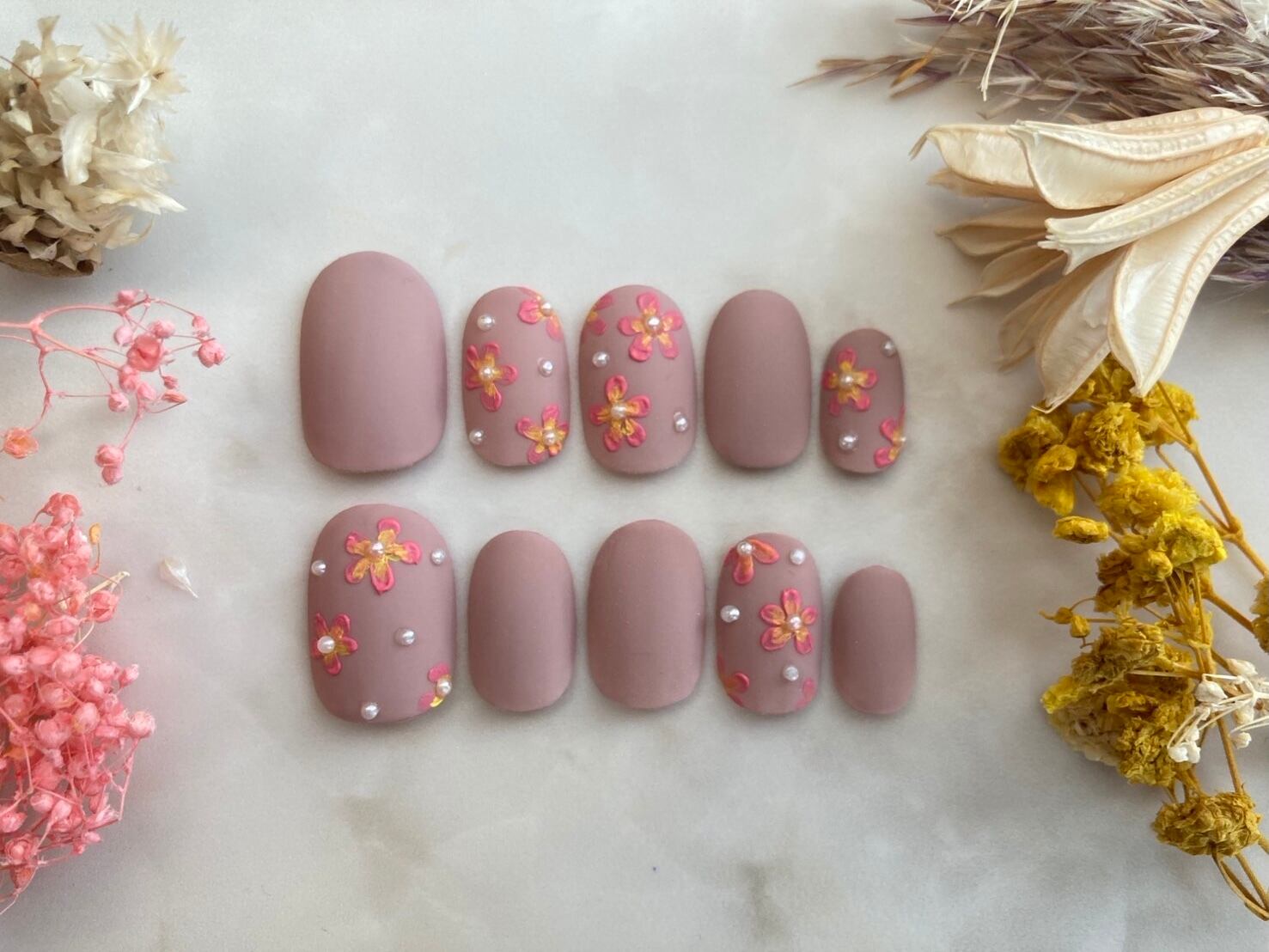マットな質感と油絵風のフラワーアートが融合した、独創的なネイルチップです。
