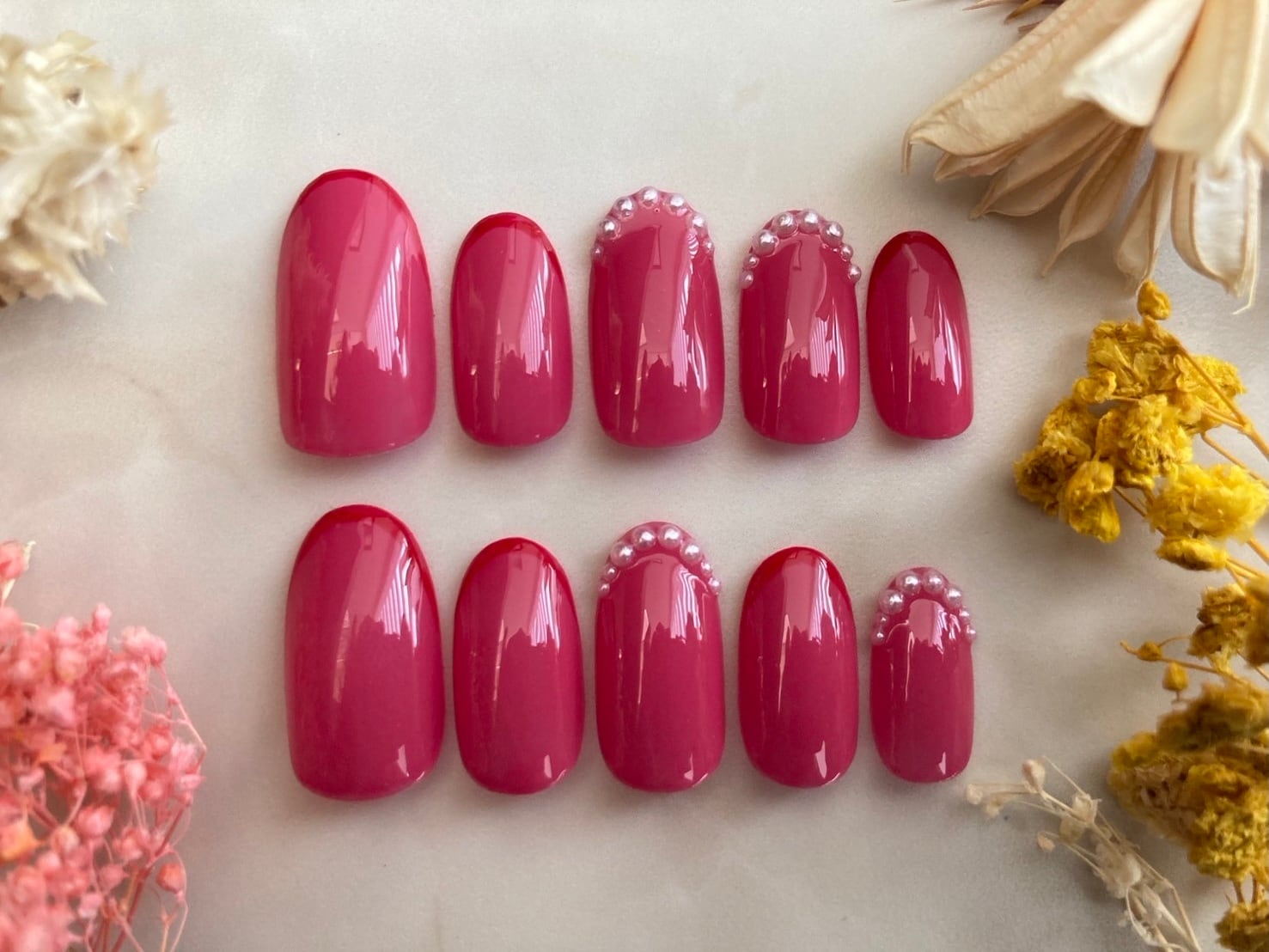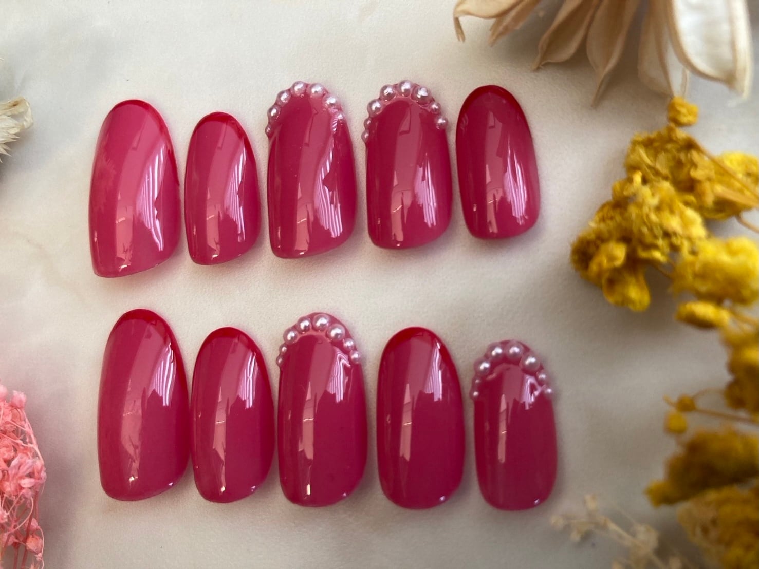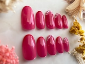 鮮やかなショッキングピンクとスキニーフレンチの絶妙なバランスが魅力のネイルチップです。明るい色合いが、指先にパッと華やかさを与え、特別な日にもぴったりのデザインとなっています。