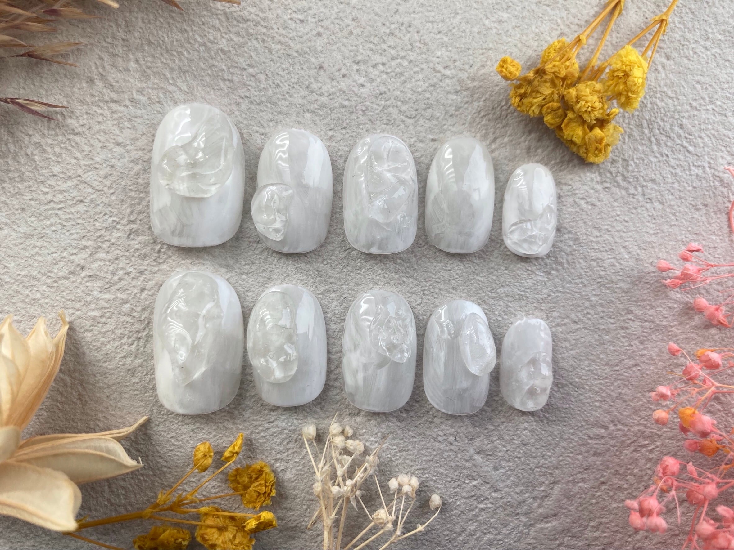 透明感のあるミルキーホワイトにニュアンスアートを重ねた上品デザインです。